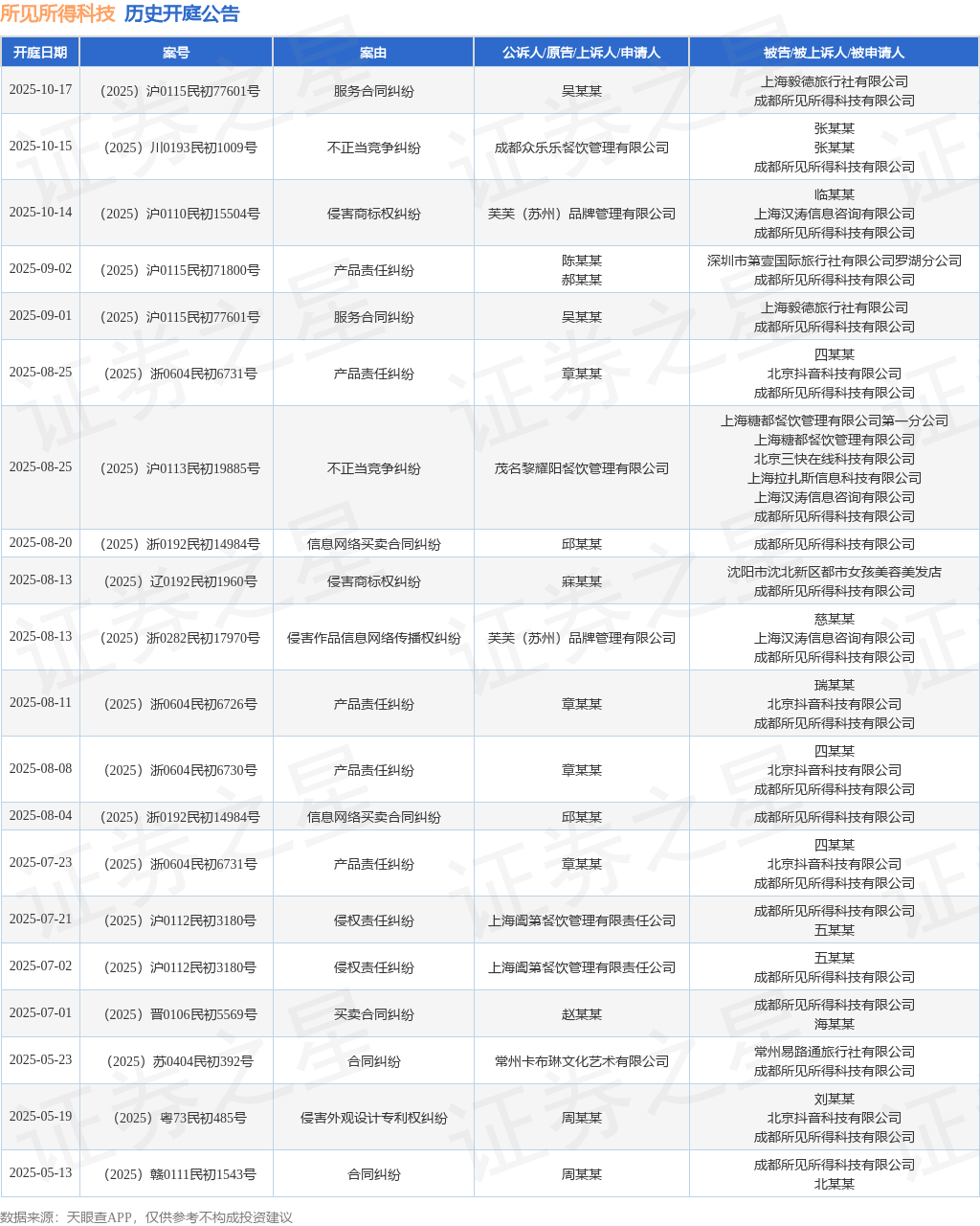 案号:(2025)川0193民初1009号根据统计,近一年内以成都所见所得科技有限公司为当事人的历史开庭公告有58则,其中案由为“侵害商标权纠纷”的公告以11则居首,其次为“侵害外观设计专利权纠纷”有8则,“信息网络买卖合同纠纷”有6则。历史开庭公告(前20条)如下: