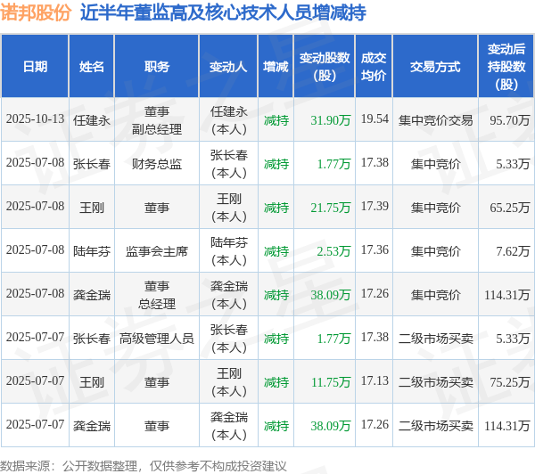 诺邦股份近半年内的董监高及核心技术人员增减持详情如下: