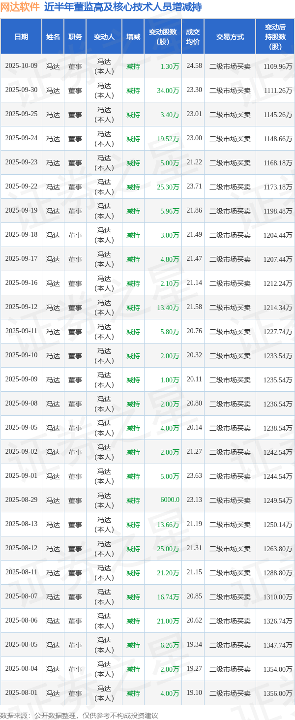 网达软件近半年内的董监高及核心技术人员增减持详情如下: