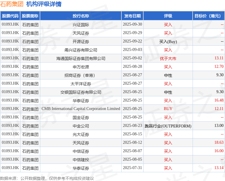 截至2025年10月14日收盘,石药集团(01093.HK)报收于8.79港元,下跌7.08%,成交量2.47亿股,成交额22.01亿港元。投行对该股的评级以买入为主,近90天内共有12家投行给出买入评级,近90天的目标均价为13.38港元。兴证国际最新一份研报给予石药集团买入评级。