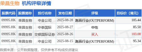 投行对该股的评级以跑赢行业(OUTPERFORM)为主,近90天内共有2家投行给出跑赢行业(OUTPERFORM)评级,近90天的目标均价为97.32港元。中金公司最新一份研报给予荣昌生物跑赢行业(OUTPERFORM)评级,目标价105.44港元。