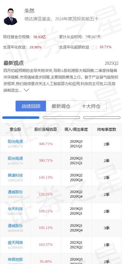 华工科技(000988)是基金经理朱然的重仓股。,其在整个职业生涯内年化收益高达19.9%。朱然的大佬持仓 - 战绩回顾截图如下: