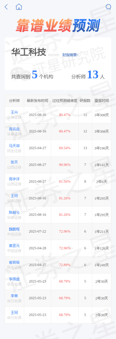 如果您对这家公司感兴趣,可以参考证星研究院统计的华工科技的分析师业绩预测数据,其中根据华泰证券的分析师王兴预测公司未来PE为19.0(更多特色估值数据尽在证星研究院,所有数据均来源公开资料,期且所有资料都存在一定时间滞后,所有相关数据均不可作为投资决策单一依据)。