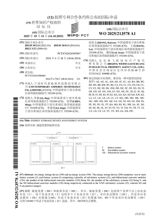 证券之星消息,根据企查查数据显示宁德时代(300750)公布了一项国际专利申请,专利名为“储能装置和能源系统”,专利申请号为PCT/CN2024/099967,国际公布日为2025年10月16日。