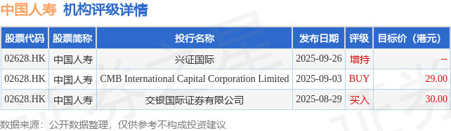 投行对该股的评级以增持为主,近90天内共有1家投行给出增持评级,近90天的目标均价为29.5港元。兴证国际最新一份研报给予中国人寿增持评级。