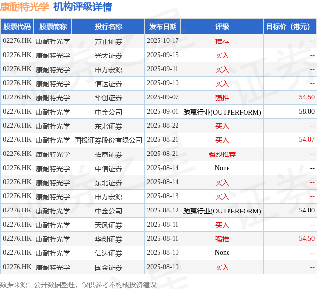 投行对该股的评级以买入为主,近90天内共有9家投行给出买入评级,近90天的目标均价为55.01港元。方正证券最新一份研报给予康耐特光学推荐评级。