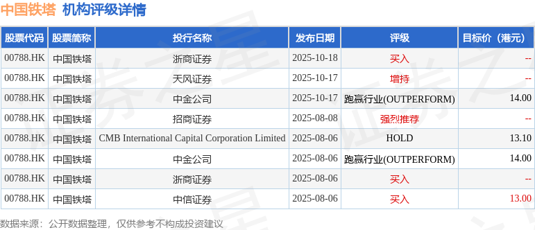 投行对该股的评级以买入为主,近90天内共有3家投行给出买入评级,近90天的目标均价为13.52港元。浙商证券最新一份研报给予中国铁塔买入评级。