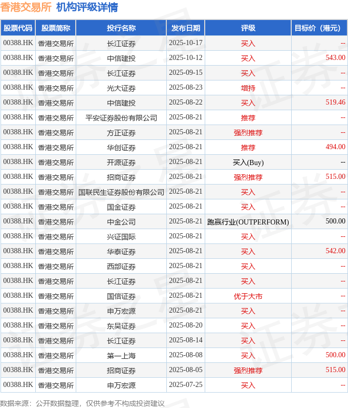 投行对该股的评级以买入为主,近90天内共有15家投行给出买入评级,近90天的目标均价为516.06港元。长江证券最新一份研报给予香港交易所买入评级。