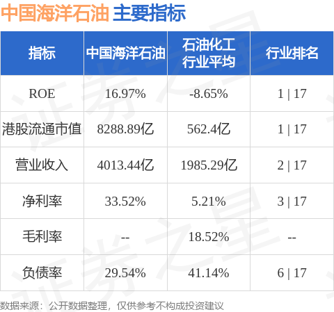 中国海洋石油港股市值8288.89亿港元,在石油化工行业中排名第1。主要指标见下表: