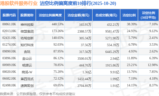 从沽空比例偏离度来看,神州控股、微盟集团、佑驾创新沽空比例偏离度位居行业前三,分别为440.53%、173.26%、140.65%。