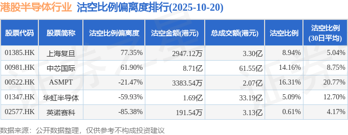 证券之星消息,10月20日港交所披露数据显示,当日港股半导体行业的24只个股中有5只被沽空,总沽空股数为1545.34万股,总沽空金额为11.05亿元(港元),而当日半导体行业的总成交金额为104.19亿元(港元),沽空比例为10.61%。当日半导体行业总体涨3.29%。