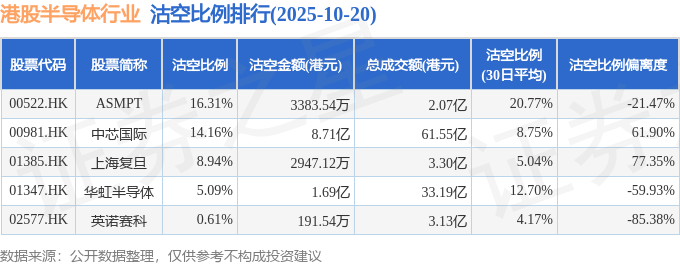 从沽空金额来看,中芯国际、华虹半导体、ASMPT沽空金额位居行业前三,分别为8.71亿港元、1.69亿港元、3383.54万港元。