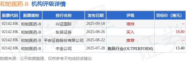 截至2025年10月20日收盘,和铂医药-B(02142.HK)报收于12.96港元,上涨1.33%,成交量203.4万股,成交额2622.8万港元。投行对该股的评级以跑赢行业(OUTPERFORM)为主,近90天内共有1家投行给出跑赢行业(OUTPERFORM)评级,近90天的目标均价为16.1港元。兴证国际最新一份研报给予和铂医药-B增持评级。