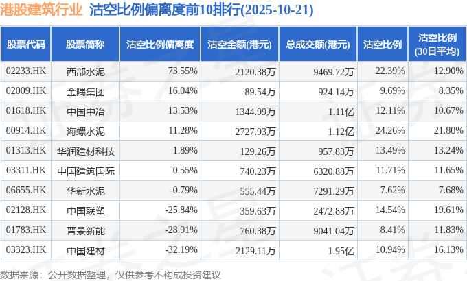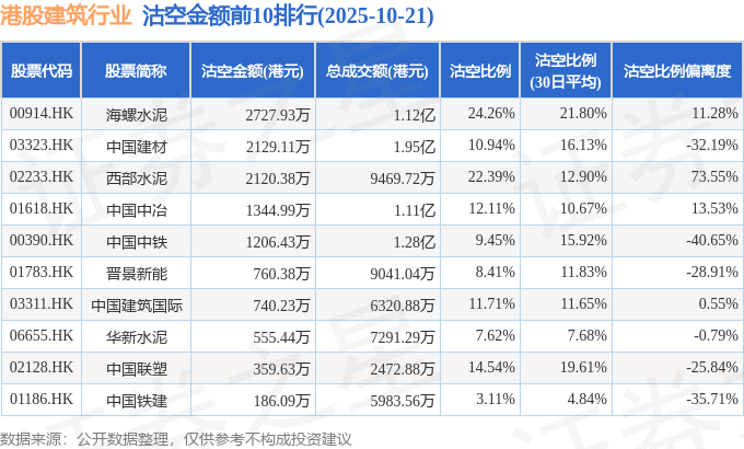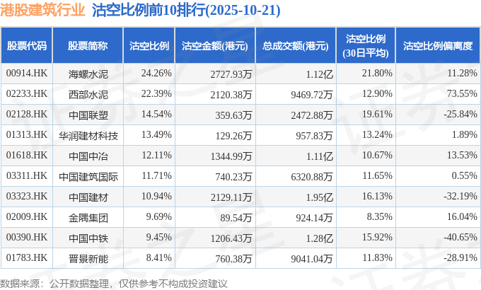 从沽空比例来看,海螺水泥、西部水泥、中国联塑沽空比例位居行业前三,分别为24.26%、22.39%、14.54%。