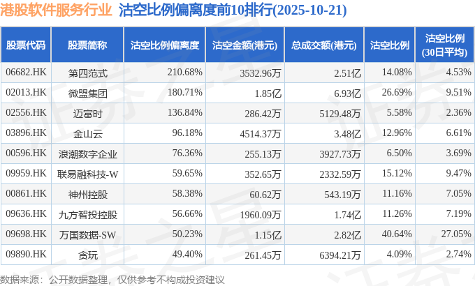 从沽空比例偏离度来看,第四范式、微盟集团、迈富时沽空比例偏离度位居行业前三,分别为210.68%、180.71%、136.84%。