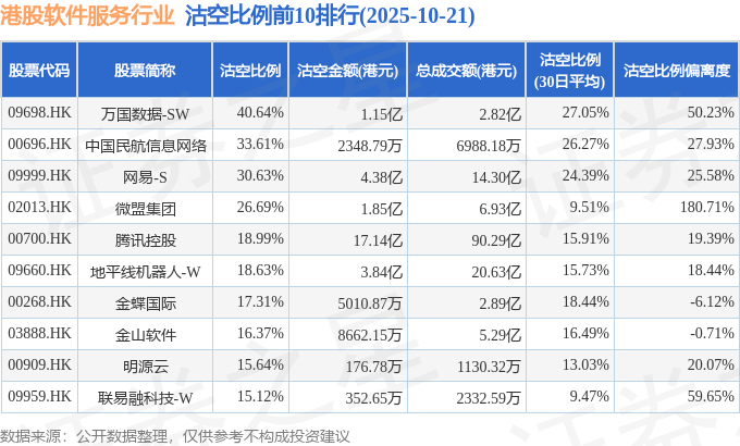 从沽空比例来看,万国数据-SW、中国民航信息网络、网易-S沽空比例位居行业前三,分别为40.64%、33.61%、30.63%。