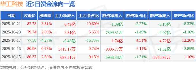 证券之星消息,截至2025年10月21日收盘,华工科技(000988)报收于82.78元,上涨3.81%,换手率7.41%,成交量74.47万手,成交额61.21亿元。