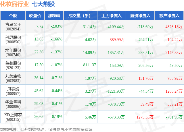个股表现方面,化妆品行业当日领跌股为青岛金王(002094),该股当日报收7.72,下跌2.03%,成交量31.14万,主力资金净流出4109.44万元。科思股份(300856)以下跌1.66%紧随其后,该股当日成交量4.62万,主力资金净流入389.99万元。除此之外,水羊股份(300740)、芭薇股份(920123)、丸美生物(603983)均进入当日熊股之列。具体个股列表见下表: