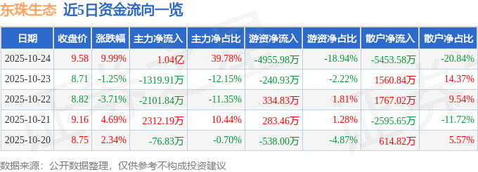 证券之星消息,截至2025年10月24日收盘,东珠生态(603359)报收于9.58元,上涨9.99%,涨停,换手率6.24%,成交量27.86万手,成交额2.62亿元。