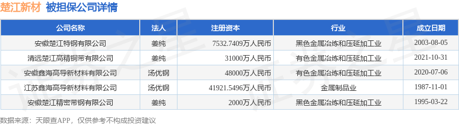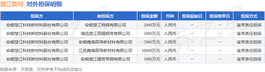 楚江新材10月23日披露5笔对外担保,被担保公司5家。对外担保明细如下表: