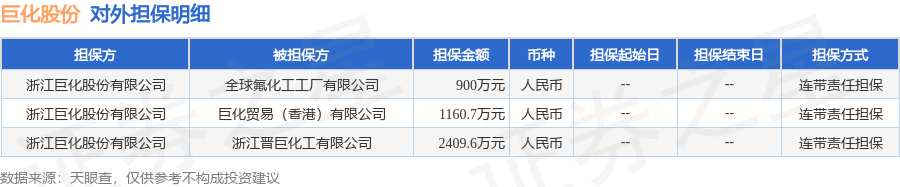 巨化股份10月23日披露3笔对外担保,被担保公司3家。对外担保明细如下表: