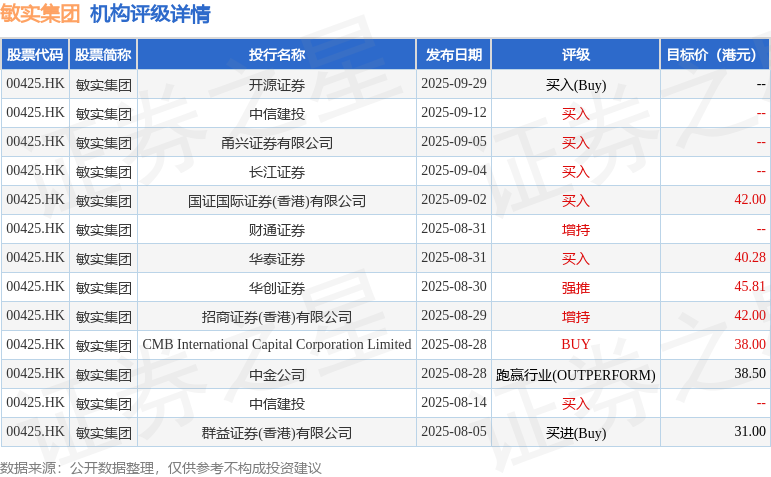 截至2025年10月24日收盘,敏实集团(00425.HK)报收于31.82港元,上涨1.14%,成交量446.87万股,成交额1.42亿港元。投行对该股的评级以买入为主,近90天内共有6家投行给出买入评级,近90天的目标均价为39.66港元。开源证券最新一份研报给予敏实集团买入(Buy)评级。