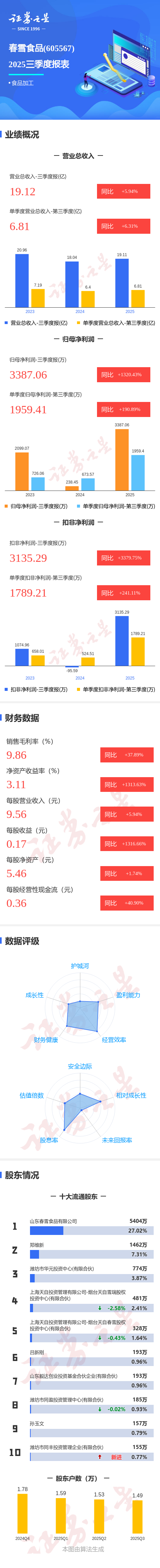 证券之星消息,春雪食品2025年三季报显示,公司主营收入19.12亿元,同比上升5.95%;归母净利润3387.06万元,同比上升1320.44%;扣非净利润3135.29万元,同比上升3379.75%;其中2025年第三季度,公司单季度主营收入6.81亿元,同比上升6.31%;单季度归母净利润1959.41万元,同比上升190.9%;单季度扣非净利润1789.21万元,同比上升241.12%;负债率51.7%,投资收益10.41万元,财务费用561.49万元,毛利率9.86%。