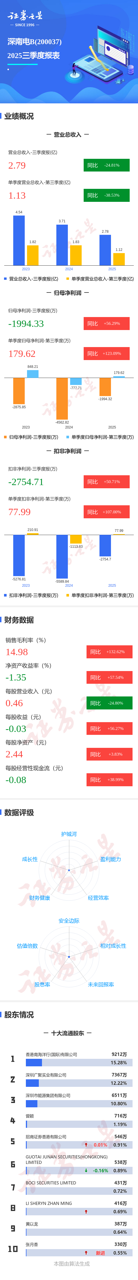 证券之星消息,深南电B2025年三季报显示,公司主营收入2.79亿元,同比下降24.82%;归母净利润-1994.33万元,同比上升56.29%;扣非净利润-2754.71万元,同比上升50.72%;其中2025年第三季度,公司单季度主营收入1.13亿元,同比下降38.54%;单季度归母净利润179.62万元,同比上升123.1%;单季度扣非净利润77.99万元,同比上升107.0%;负债率25.31%,投资收益1675.81万元,财务费用330.51万元,毛利率14.98%。