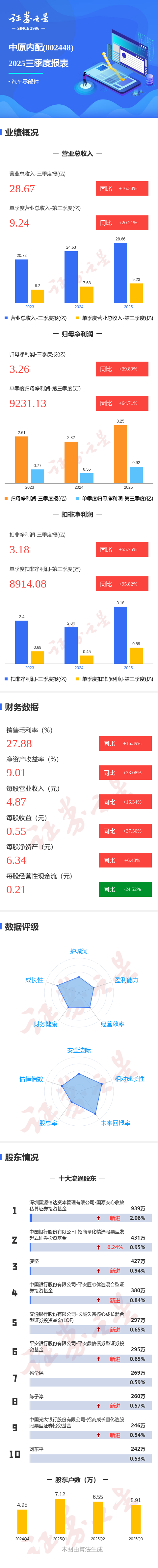 证券之星消息,中原内配2025年三季报显示,公司主营收入28.67亿元,同比上升16.35%;归母净利润3.26亿元,同比上升39.89%;扣非净利润3.18亿元,同比上升55.76%;其中2025年第三季度,公司单季度主营收入9.24亿元,同比上升20.22%;单季度归母净利润9231.13万元,同比上升64.72%;单季度扣非净利润8914.08万元,同比上升95.82%;负债率31.59%,投资收益3106.17万元,财务费用876.81万元,毛利率27.88%。