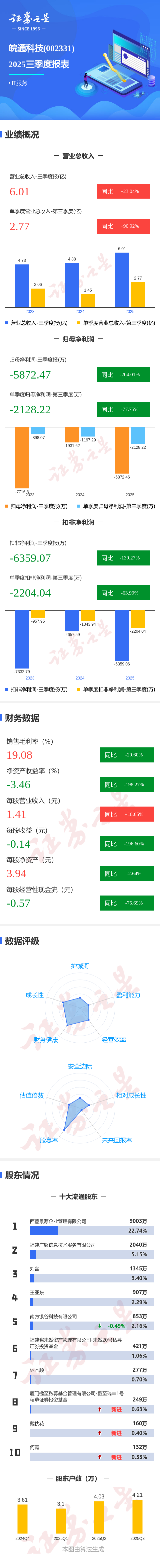 证券之星消息,皖通科技2025年三季报显示,公司主营收入6.01亿元,同比上升23.05%;归母净利润-5872.47万元,同比下降204.02%;扣非净利润-6359.07万元,同比下降139.28%;其中2025年第三季度,公司单季度主营收入2.77亿元,同比上升90.93%;单季度归母净利润-2128.22万元,同比下降77.75%;单季度扣非净利润-2204.04万元,同比下降64.0%;负债率41.75%,投资收益-48.67万元,财务费用366.77万元,毛利率19.08%。