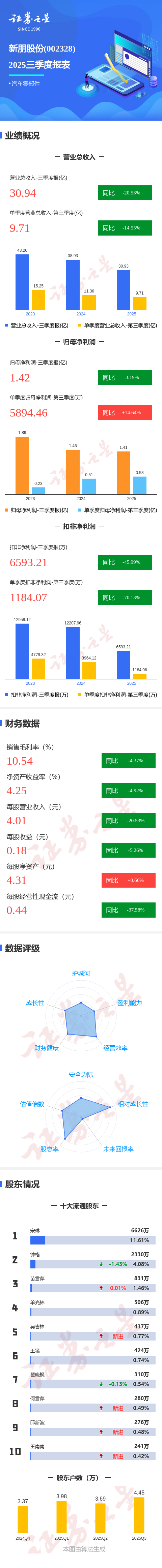 证券之星消息,新朋股份2025年三季报显示,公司主营收入30.94亿元,同比下降20.53%;归母净利润1.42亿元,同比下降3.2%;扣非净利润6593.21万元,同比下降45.99%;其中2025年第三季度,公司单季度主营收入9.71亿元,同比下降14.56%;单季度归母净利润5894.46万元,同比上升14.65%;单季度扣非净利润1184.07万元,同比下降70.13%;负债率32.18%,投资收益8332.22万元,财务费用-290.93万元,毛利率10.54%。