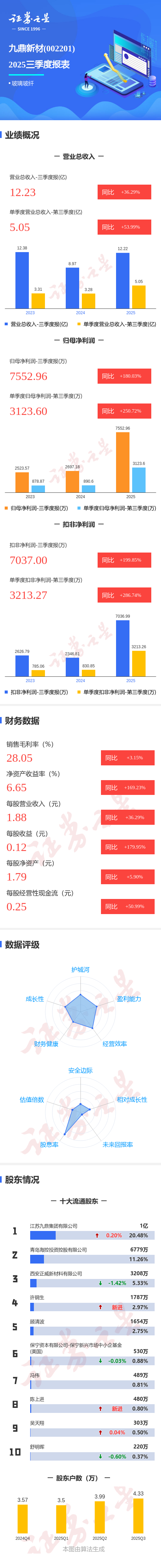 证券之星消息,九鼎新材2025年三季报显示,公司主营收入12.23亿元,同比上升36.29%;归母净利润7552.96万元,同比上升180.03%;扣非净利润7037.0万元,同比上升199.85%;其中2025年第三季度,公司单季度主营收入5.05亿元,同比上升53.99%;单季度归母净利润3123.6万元,同比上升250.73%;单季度扣非净利润3213.27万元,同比上升286.74%;负债率63.25%,投资收益-143.59万元,财务费用1727.59万元,毛利率28.05%。