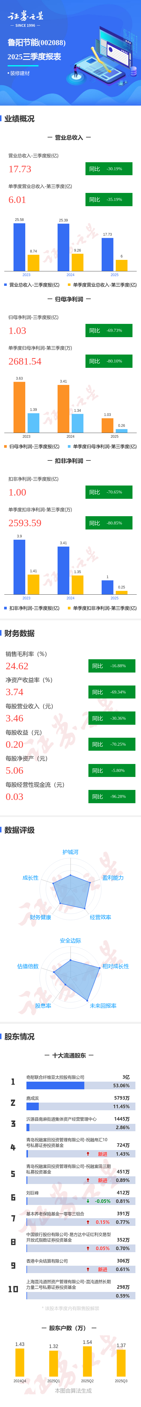证券之星消息,鲁阳节能2025年三季报显示,公司主营收入17.73亿元,同比下降30.19%;归母净利润1.03亿元,同比下降69.73%;扣非净利润1.0亿元,同比下降70.65%;其中2025年第三季度,公司单季度主营收入6.01亿元,同比下降35.2%;单季度归母净利润2681.54万元,同比下降80.11%;单季度扣非净利润2593.59万元,同比下降80.85%;负债率19.58%,财务费用-241.25万元,毛利率24.62%。