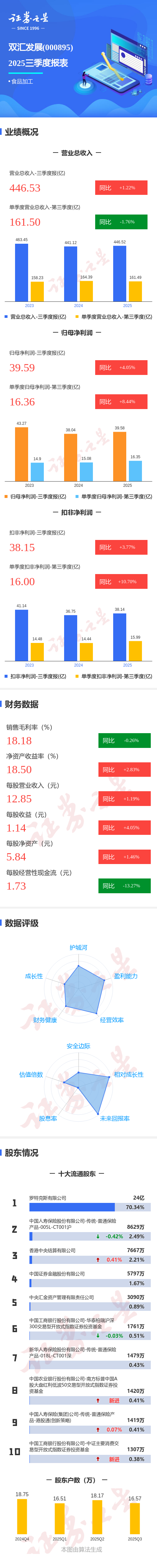 证券之星消息,双汇发展2025年三季报显示,公司主营收入446.53亿元,同比上升1.23%;归母净利润39.59亿元,同比上升4.05%;扣非净利润38.15亿元,同比上升3.78%;其中2025年第三季度,公司单季度主营收入161.5亿元,同比下降1.77%;单季度归母净利润16.36亿元,同比上升8.45%;单季度扣非净利润16.0亿元,同比上升10.7%;负债率49.68%,投资收益6560.01万元,财务费用6592.79万元,毛利率18.18%。