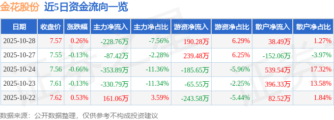证券之星消息,截至2025年10月28日收盘,金花股份(600080)报收于7.57元,上涨0.26%,换手率1.07%,成交量3.99万手,成交额3025.34万元。