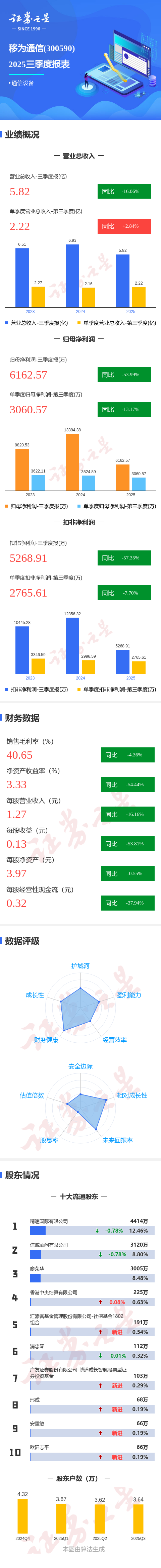 证券之星消息,移为通信2025年三季报显示,公司主营收入5.82亿元,同比下降16.06%;归母净利润6162.57万元,同比下降53.99%;扣非净利润5268.91万元,同比下降57.36%;其中2025年第三季度,公司单季度主营收入2.22亿元,同比上升2.84%;单季度归母净利润3060.57万元,同比下降13.17%;单季度扣非净利润2765.61万元,同比下降7.71%;负债率10.71%,投资收益190.09万元,财务费用-961.2万元,毛利率40.65%。