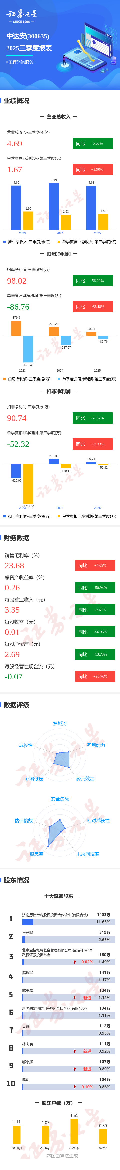 证券之星消息,中达安2025年三季报显示,公司主营收入4.69亿元,同比下降5.03%;归母净利润98.02万元,同比下降56.3%;扣非净利润90.74万元,同比下降57.87%;其中2025年第三季度,公司单季度主营收入1.67亿元,同比上升1.91%;单季度归母净利润-86.76万元,同比上升63.48%;单季度扣非净利润-52.32万元,同比上升72.33%;负债率70.44%,投资收益73.43万元,财务费用1390.45万元,毛利率23.68%。