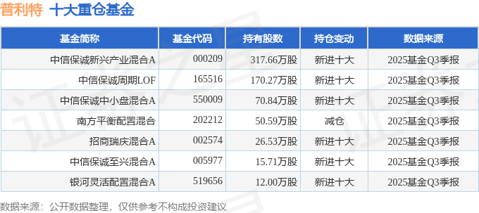 持有普利特最多的基金为中信保诚新兴产业混合A,目前规模为18.39亿元,最新净值2.7664(10月28日),较上一交易日上涨0.77%,近一年上涨22.94%。该基金现任基金经理为孙浩中。