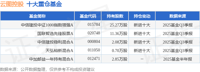 持有云图控股最多的基金为中信建投中证1000指数增强A,目前规模为2.36亿元,最新净值1.3679(10月27日),较上一交易日上涨0.59%,近一年上涨36.89%。该基金现任基金经理为王鹏。