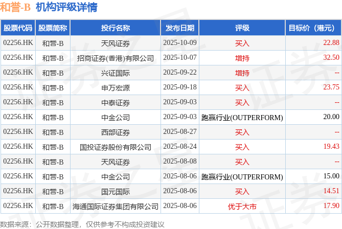 投行对该股的评级以买入为主,近90天内共有7家投行给出买入评级,近90天的目标均价为20.75港元。天风证券最新一份研报给予和誉-B买入评级,目标价22.88港元。