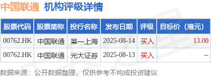 投行对该股的评级以买入为主,近90天内共有2家投行给出买入评级,近90天的目标均价为13港元。第一上海最新一份研报给予中国联通买入评级,目标价13港元。