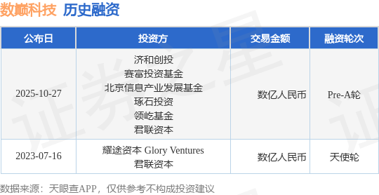 证券之星消息,根据天眼查APP于10月27日公布的信息整理,北京数巅科技有限公司Pre-A轮融资,融资额数亿人民币,参与投资的机构包括济和创投,赛富投资基金,北京信息产业发展基金,琢石投资,领屹基金,君联资本。