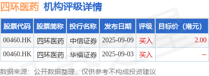 投行对该股的评级以买入为主,近90天内共有2家投行给出买入评级,近90天的目标均价为2港元。中信证券最新一份研报给予四环医药买入评级,目标价2港元。