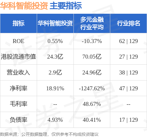 华科智能投资港股市值24.3亿港元,在多元金融行业中排名第27。主要指标见下表: