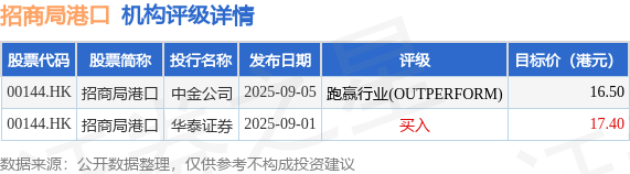截至2025年10月30日收盘,招商局港口(00144.HK)报收于15.39港元,上涨1.12%,成交量310.3万股,成交额4753.9万港元。投行对该股的评级以跑赢行业(OUTPERFORM)为主,近90天内共有1家投行给出跑赢行业(OUTPERFORM)评级,近90天的目标均价为16.95港元。中金公司最新一份研报给予招商局港口跑赢行业(OUTPERFORM)评级,目标价16.5港元。