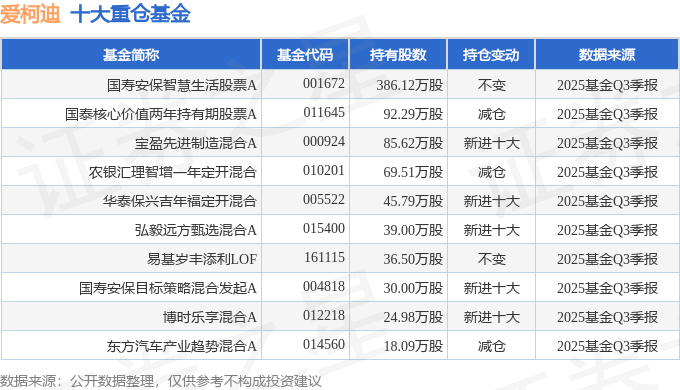 持有爱柯迪最多的基金为国寿安保智慧生活股票A,目前规模为22.1亿元,最新净值1.917(10月29日),较上一交易日上涨1.05%,近一年上涨54.47%。该基金现任基金经理为张琦。