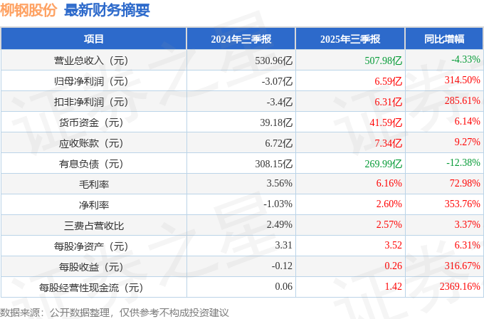 据证券之星公开数据整理,近期柳钢股份(601003)发布2025年三季报。截至本报告期末,公司营业总收入507.98亿元,同比下降4.33%,归母净利润6.59亿元,同比上升314.5%。按单季度数据看,第三季度营业总收入161.23亿元,同比上升5.57%,第三季度归母净利润2.92亿元,同比上升180.63%。本报告期柳钢股份短期债务压力上升,流动比率达0.62。