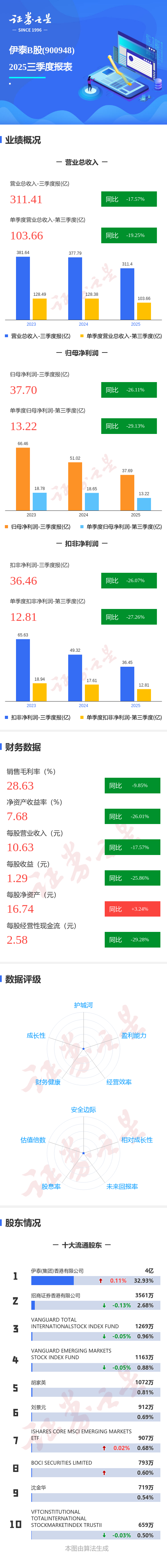 证券之星消息,伊泰B股2025年三季报显示,前三季度公司主营收入311.41亿元,同比下降17.57%;归母净利润37.7亿元,同比下降26.11%;扣非净利润36.46亿元,同比下降26.08%;其中2025年第三季度,公司单季度主营收入103.66亿元,同比下降19.26%;单季度归母净利润13.22亿元,同比下降29.13%;单季度扣非净利润12.81亿元,同比下降27.26%;负债率39.81%,投资收益7.61亿元,财务费用3.46亿元,毛利率28.63%。
