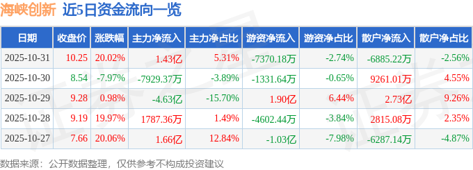 10月31日的资金流向数据方面,主力资金净流入1.43亿元,占总成交额5.31%,游资资金净流出7370.18万元,占总成交额2.74%,散户资金净流出6885.22万元,占总成交额2.56%。