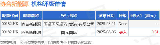 截至2025年10月31日收盘,协合新能源(00182.HK)报收于0.39港元,上涨1.32%,成交量969.0万股,成交额369.0万港元。投行对该股的评级以买入为主,近90天内共有1家投行给出买入评级,近90天的目标均价为0.61港元。国证国际证券(香港)有限公司最新一份研报给予协合新能源None评级。